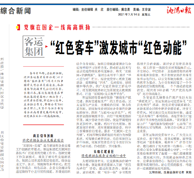 7月14日,沈陽(yáng)日?qǐng)?bào)以《 “紅色客車(chē)”激發(fā)城市“紅色動(dòng)能”》為題報(bào)道了沈陽(yáng)客運(yùn)集團(tuán)以黨建為引領(lǐng),助推企業(yè)高質(zhì)量發(fā)展之新變化。