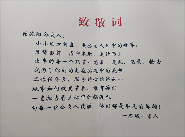 沈陽家書致敬信致敬詞這樣寫著:沈陽公交人小小的方向盤是公交人手中的世界,疫情當(dāng)前,恪守本職,逆行而上。出車前的每一個環(huán)節(jié),消毒通風(fēng)記錄檢查,成為了你們刻在腦海中的流程,工作任務(wù)雖然多,但服務(wù)乘客的心始終如一。不管城市如何改變節(jié)奏,唯有你們一直擔(dān)當(dāng)著生活中的擺渡人,向每一位公交人致敬!你們都是平凡的英雄!