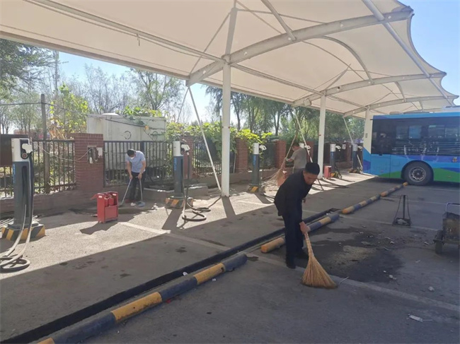 在活動現(xiàn)場,黨員干部沖鋒在前,大家充分發(fā)揮團(tuán)隊精神,齊心協(xié)力,干勁十足,彰顯奮勇當(dāng)先的風(fēng)貌。這邊拿著打掃工具對場站院內(nèi)的枯枝落葉、垃圾等進(jìn)行全面清理,那邊拿著洗車槍對站房的玻璃及地面進(jìn)行清潔與沖刷,不留死角。經(jīng)過兩個小時的“奮戰(zhàn)”,場站被清理得干干凈凈,整體面貌煥然一新。