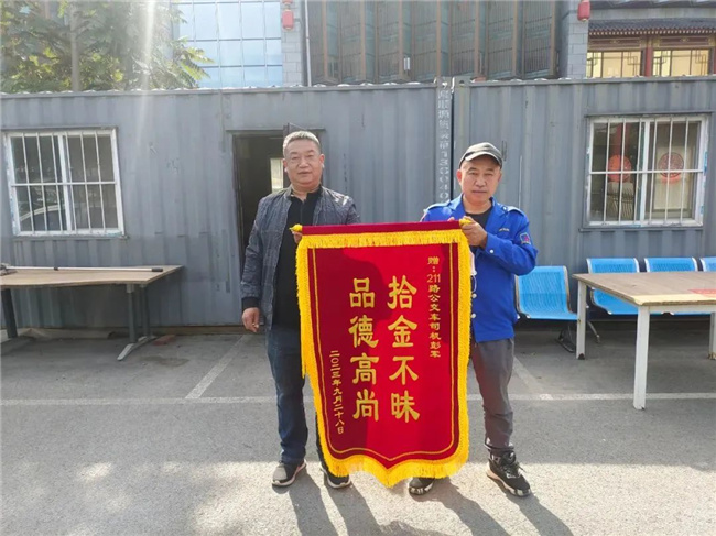10月7日,一名乘客帶著寫有“拾金不昧 品德高尚”的錦旗來到211.222路車隊,以此表達(dá)對駕駛員彭軍的感激之情。