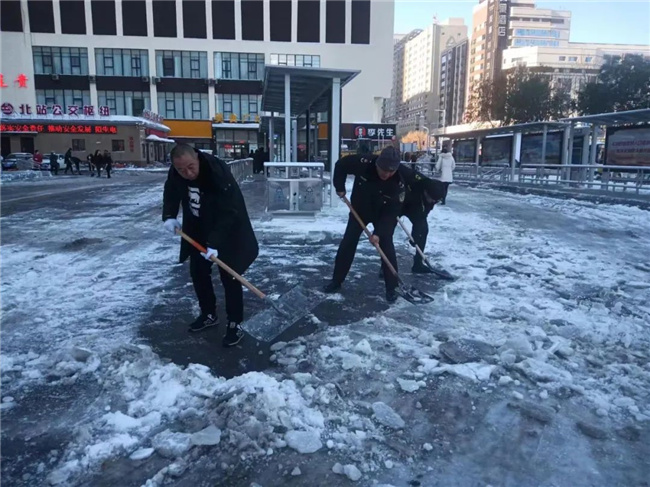 清掃公交樞紐站積雪,保障車(chē)輛安全進(jìn)出站。