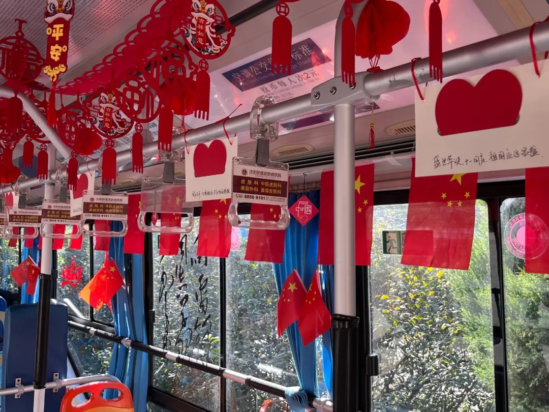 場面三:在沈陽市勞動模范、260路駕駛員繆立眾的車廂內(nèi),紅彤彤的國旗懸掛車廂兩側(cè),一句句祝福寄語祖國,讓市民在乘車時也感受到濃厚的愛國情懷。