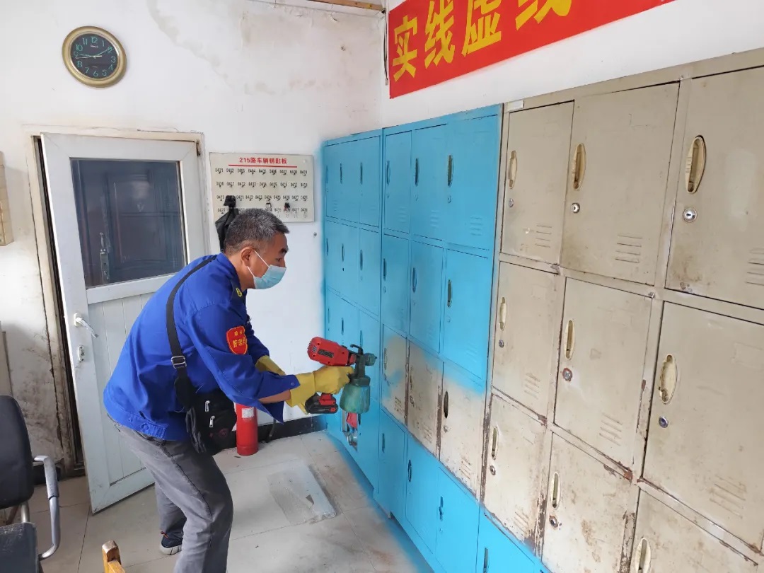 場面五:215路駕駛員陳守春利用自己的休息時間,帶來噴漆及工具,為大家的更衣柜穿了一件嶄新的“外衣”,美化車隊環(huán)境的同時,又增添了濃郁的節(jié)日氣氛。