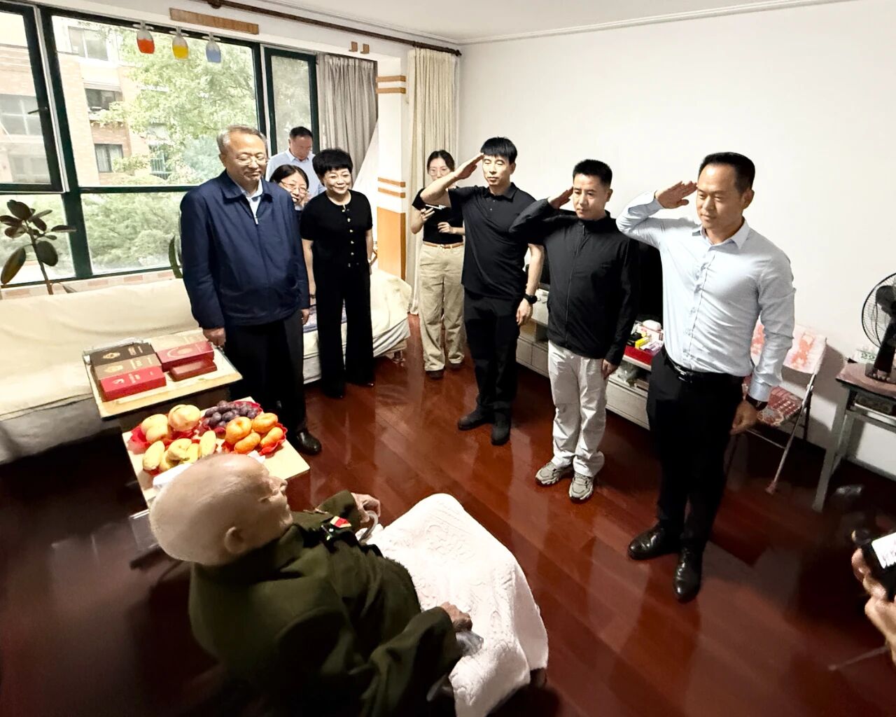 慰問過程中,韓宗森老同志與家人深情回顧了當(dāng)年的革命歷程,特別是抗戰(zhàn)時期的崢嶸歲月和英勇事跡?,F(xiàn)場氣氛熱烈,韓老還和大家一起高唱《中國人民志愿軍戰(zhàn)歌》。雖已年過九旬,他依然思維敏捷、聲音洪亮、精神矍鑠。在場的工作人員和退役軍人無不為之動容,自發(fā)地向韓老行莊嚴(yán)的軍禮,表達(dá)由衷的敬意。