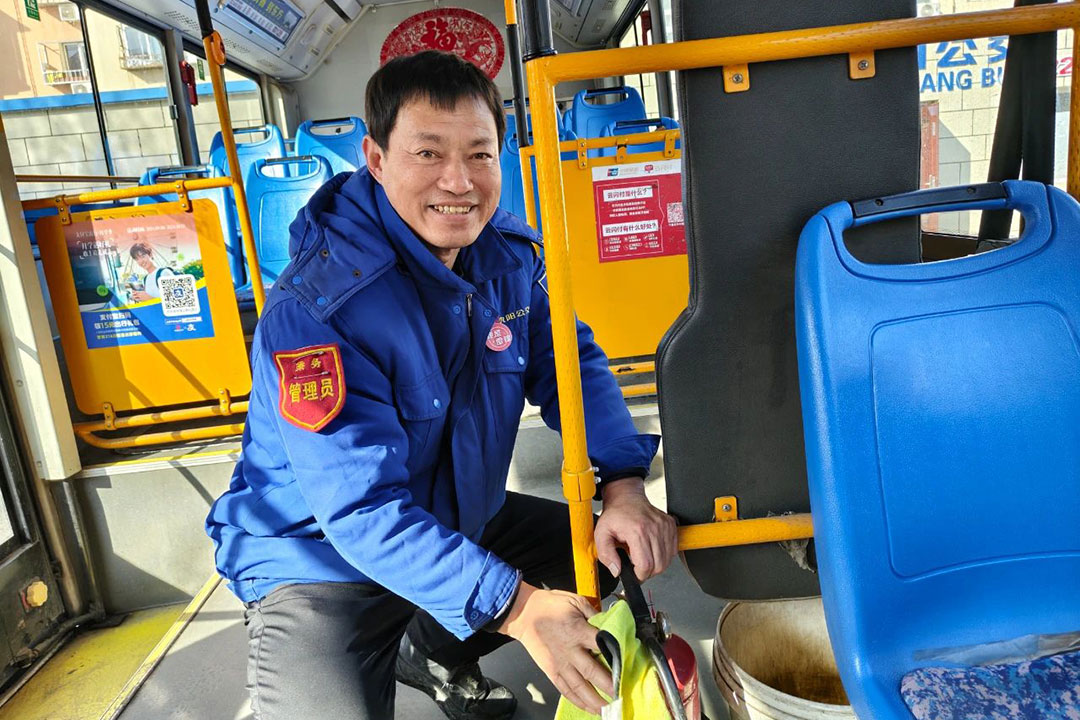 在219路大二臺(tái)子公交站臺(tái),一位拄拐老人正在志愿者的攙扶下平穩(wěn)登車;寒風(fēng)中,身穿紅馬甲的工作人員細(xì)心擦拭著候車長(zhǎng)椅;車廂里,...