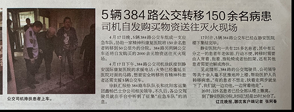 醫(yī)院里有不少肢體障礙的病人、生活不能自理的病人,還有一些精神病患者,從醫(yī)院轉(zhuǎn)移到車?yán)锸殖粤ΑA粝碌?名駕駛員和下班后聞訊趕到的馮永斌等7名駕駛員毫不猶豫地沖上前,連扶帶抬,連背帶扛,將患者轉(zhuǎn)移到車上。醫(yī)院對面就是火場,駕駛員們不顧自身安危,連水都來不及喝上一口,緊張有序、有條不紊的進(jìn)行疏散工作。直至晚23時30分,成功將所有醫(yī)患人員輸送至馬耳山分院。