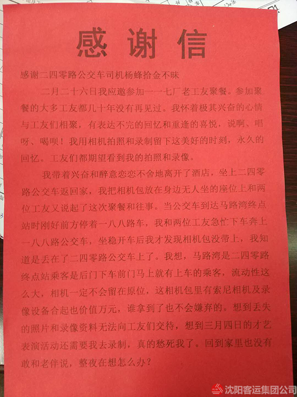 原來,當日下午徐沛華老人剛剛參加完老工友聚會,在乘坐240路公交車回家時將攜帶的攝影包遺落在車上,到家后才發(fā)現(xiàn)自己的攝影包丟失了。老人回想可能是遺落在240路車上了,他抱著試試看的態(tài)度來到240車隊,令他沒想到的是,相機完好無損的在那里等待它主人的到來,失而復得的喜悅讓老人激動不已,老人說,“昨晚我一夜沒有睡好,相機里的照片和視頻對我來說是非常珍貴的,要是丟了我真不知道怎么辦才好,真的非常感謝駕駛員楊峰同志......”隨后,老人親自把“拾金不昧 弘揚正氣”的錦旗送到了楊峰手中,“楊師傅的這種拾金不昧的精神是雷鋒精神的一種傳承,是現(xiàn)在年輕人學習的榜樣”,老人激動的說。在公交車這個不足十平米的車廂里,楊峰用自己的善舉為城市文明傳遞著一份正能量。